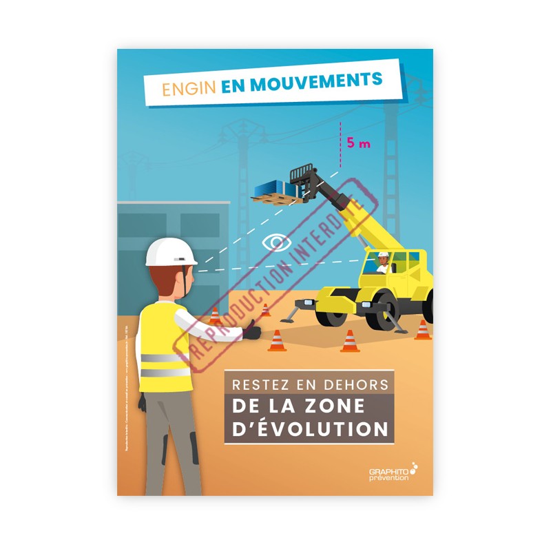 Cette affiche sensibilise aux risques liés à la co-activité entre engins et piétons sur les zones de travail. La circulation d’engins, souvent imposants et à visibilité réduite, expose les personnes à pied à des dangers importants, notamment en cas de proximité ou d’inattention.